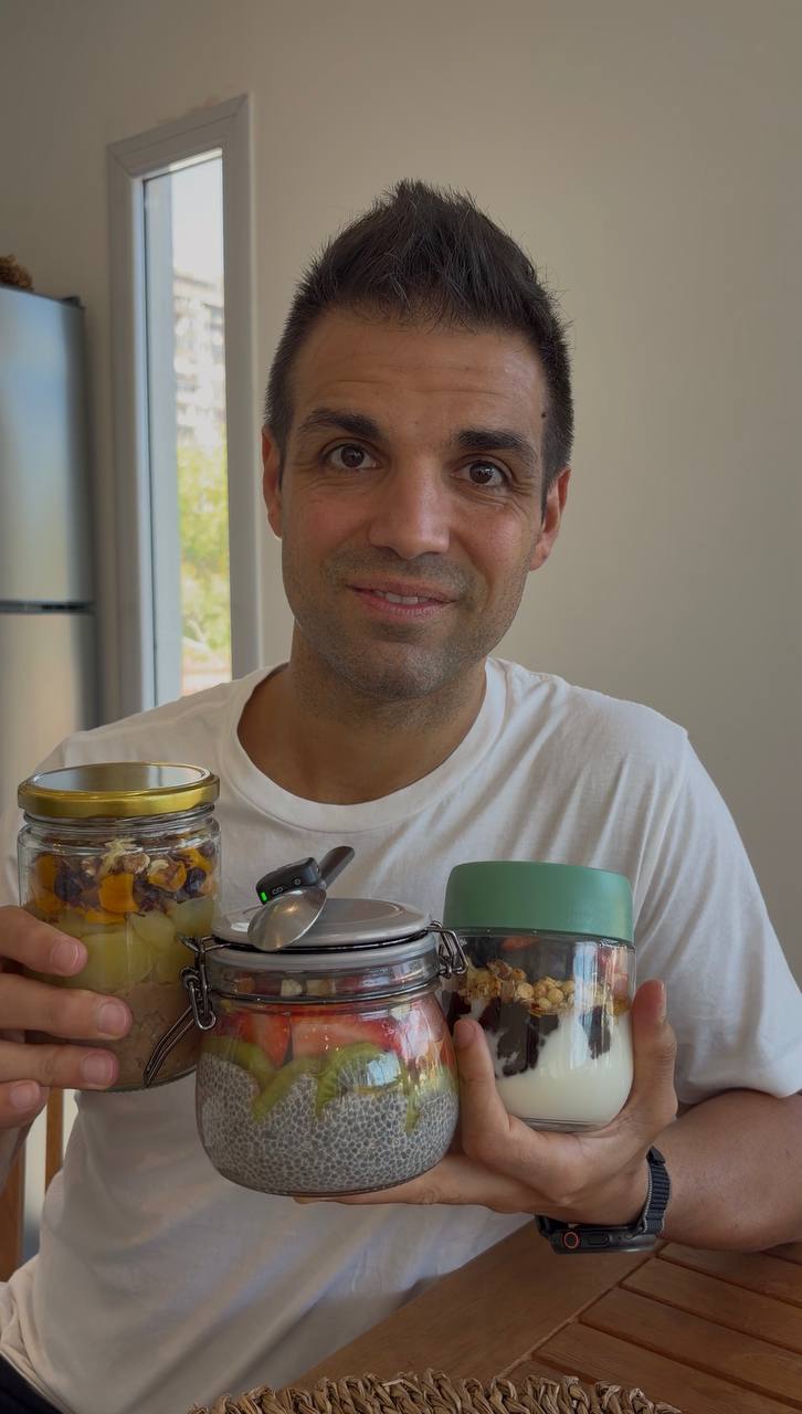 La mezcla de avena va en la base del frasco, luego capa de manzanas, de frutas rehidratadas y arriba nueces picadas. Se puede servir tibio con trocitos de chocolate semiamargo.